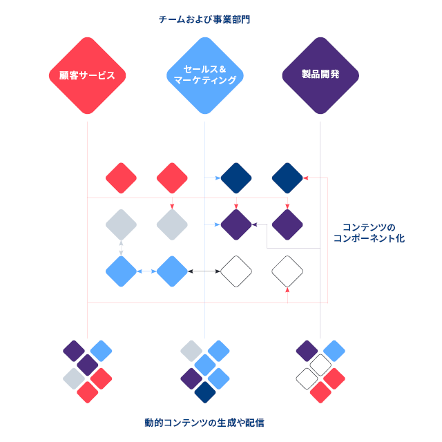 構造化コンテンツ管理では、情報をより小さな構成要素(コンポーネント)に分解し、これが信頼できる唯一の情報源となります。作成、更新、自動化、再利用が簡単かつグローバルに行えるため、求められる規模とスピードで自信を持って作業できます。